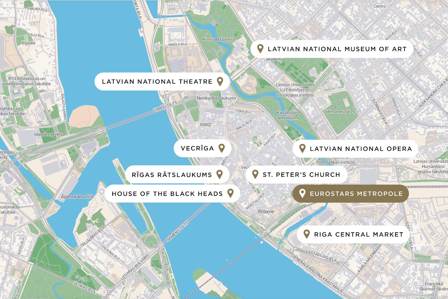 Getting to the Eurostars Metropole is easy. If you are travelling by private car, you can enter the address “36/38 Aspazijas Boulevard, Riga, Latvia” into your GPS. The route is clearly signposted.