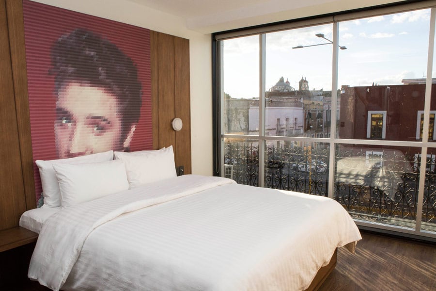 But if Ikonik Hotel Puebla is known for one thing it is its design, with a hanging curved-glass façade, which is the only one of its kind. Because innovative, colourful design and a commitment to a youthful spirit are what define the Ikonik philosophy. A functional, practical hotel, inspired by the great icons of history, each room features references from a film, architecture or music, personalised with a full-wall focal piece with elements of the logo.
